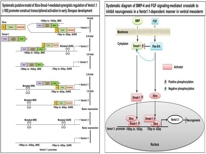 Figure 5. The putative model of Xbra-Smad-1-mediated synergistic regulation of ventx1.1 transcriptional activation and neurogenesis inhibition in VMZ during early Xenopus development. The putative synergistic transcriptional activation of ventx1.1 (−180) promoter is regulated by the physical interaction of Smad-1 and Xbra in Xenopus embryos. BMP-4/Smad-1 and FGF/Xbra mediate a crosstalk in VMZ, inhibiting neurogenesis in a Ventx1.1-dependent manner during embryonic development of Xenopus.