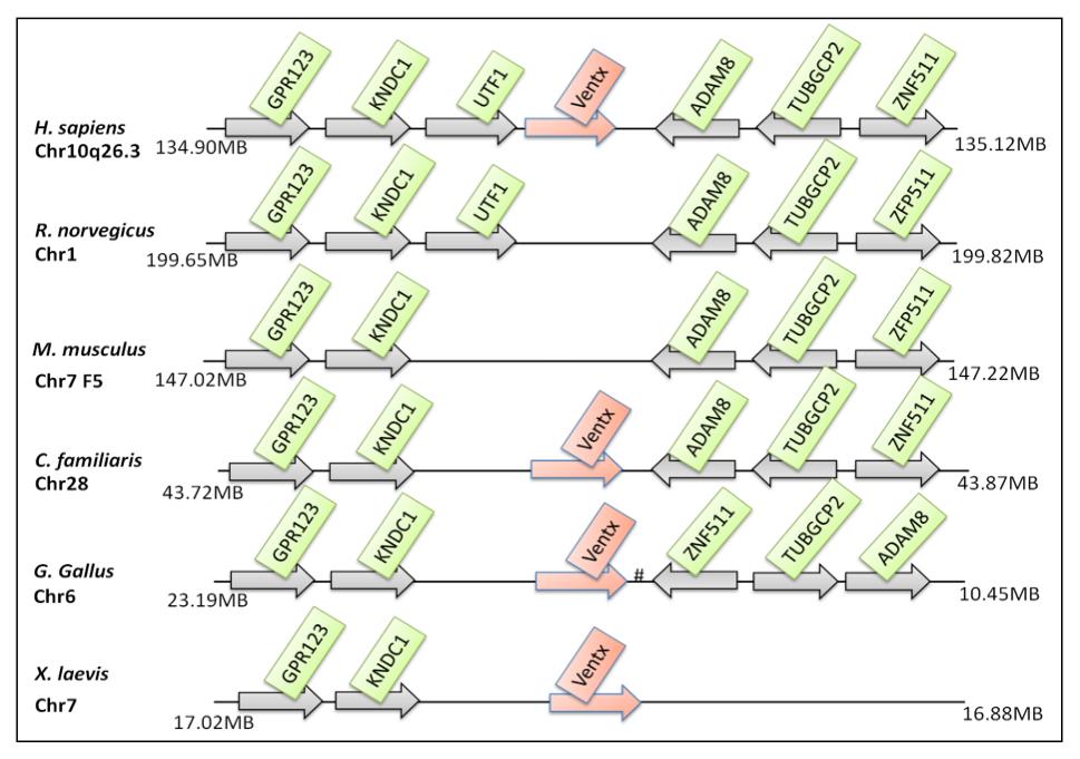 Supplementary Figure 2a. Chromosomal localization of ventx gene synteny in human, dog, chicken, and Xenopus genomes. Ventx synteny is evolutionarily conserved in human (H. sapiens), dog (C. familiaris), chicken (G. Gallus), and frog (X. laevis) genomes while Ventx synteny has been lost in rat (R. norvegicus) and mouse (M. musculus) genomes.