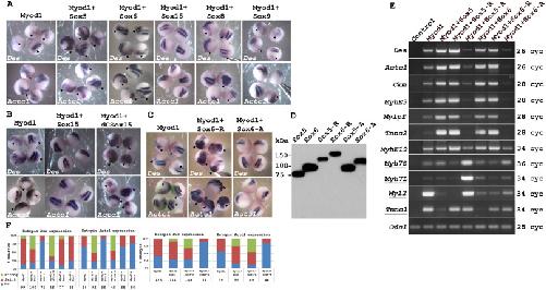Fig. 2. Sox5 and Sox6 enhance muscle gene transcription in Myod1-induced myogenic transcription assay, acting as a transrepressor except for slow muscle-specific genes. (A) In situ hybridization experiments show ectopic expression of Des and Actc1 (arrowheads) in embryos injected unilaterally either with Myod1 synthetic mRNA alone (100 pg), or co-injected with Sox5, Sox6, Sox15, Sox8 or Sox9 (400 pg each) and fixed at neurula stage. (B) Embryos were injected unilaterally either with Myod1 synthetic mRNA (100 pg) alone or co-injected with Sox15 or dCSox15 (400 pg each), fixed at neurula stage and probed with Des and Actc1. (C) Embryos were injected unilaterally either with Myod1 synthetic mRNA (100 pg) alone or co-injected with Sox6-R or Sox6-A (400 pg each), fixed at neurula stage and probed with Des and Actc1. The arrowhead indicates ectopic expression. Probe is shown in the bottom right corner of each panel. (D) Western blot with anti-flag antibodies of late gastrula embryos injected bilaterally either with 400 pg of Sox5, Sox6, Sox5-R, Sox6-R, Sox5-A, or Sox6-A synthetic mRNAs. Molecular weight markers are indicated in kilodalton (kDa). (E) Expression of Des, Actc1, Ckm, MyhE3, Mylpf, Tnnc2, MyhE19, Myh7L, Myh7S, Myl2 and Tnnc1 determined by semi-quantitative RT-PCR from RNA extracted of animal cap explants. Embryos were bilaterally injected with Myod1 synthetic mRNA (100 pg) alone or co-injected with Sox5, Sox5-R, Sox5-A, Sox6, Sox6-R or Sox6-A (400 pg each). Number of PCR cycles was indicated on the left. Slow muscle-specific genes are underlined. (F) Bar graph showing percentage of embryos with no, faint or strong ectopic expression. Chi-squared test analysis for ectopic Des expression of different Sox constructs: Myod1 versus Sox5 (P value< 0,0001), Sox15 (P value< 0,0001), dCSox15 (P value< 0,0001), Sox8 non-significant (ns), Sox9 ns, for ectopic Actc1 expression of different Sox constructs: Myod1 versus Sox5(P value< 0,0001), Sox15 (P value=0,0021), dCSox15 (P value< 0,0001), Sox8 ns, Sox9 ns, for ectopic Des expression of different Sox6 constructs: Myod1 versus Sox6 (P value= 0,0140), Sox6-R (P value< 0,0001), Sox6-A (P value< 0,0001), for ectopic Actc1 expression of different Sox6 constructs: Myod1 versus Sox6 (P value< 0,0001), Sox6-R (P value< 0,0001), Sox6-A (P value= 0,0071). Numbers of injected embryos are indicated at the bottom of each bar.