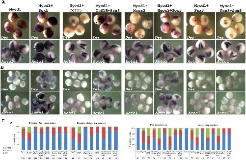 Fig. 3. Sox5 antagonizes the inhibitory effect of Tcf15 and Meox2 in Myod1-induced myogenic transcription assay. (A) Embryos were injected unilaterally either with Myod1 synthetic mRNA (100 pg) alone or co-injected with Tcf15, Tcf15 plus Sox5, Meox2, Meox2 plus Sox5, Pax3 or Pax3 plus Sox5 (400 pg each), fixed at neurula stage and probed with Des and Actc1. (B) Same experiments here as in (A) on animal cap explants. The arrowhead indicates ectopic expression. Probe is shown in the bottom right corner of each panel. (C) Bar graph showing percentage of embryos with no, faint or strong ectopic expression. Chi-squared test analysis for ectopic Des expression: Myod1 versus Sox5 (P = 0,0008), Tcf15 (P value< 0,0001), Meox2 (P value< 0,0001), Pax3 (P value< 0,0001), Myod1+Tcf15 versus Myod1+Tcf15+Sox5 (P value< 0,0001), Myod1+Meox2 versus Myod1+Meox2+Sox5(P value< 0,0001), Myod1+Pax3 versus Myod1+Pax3+Sox5 ns, for ectopic Actc1 expression: Myod1 versus Sox5 (P = 0,0207), Tcf15 (P value< 0,0001), Meox2 (P value = 0,0040), Pax3 (P value = 0,0002), Myod1+Tcf15 versus Myod1+Tcf15+Sox5 (P value = 0,0008), Myod1+Meox2 versus Myod1+Meox2+Sox5 (P value = 0,0039), Myod1+Pax3 versus Myod1+Pax3+Sox5 ns, for ectopic Des expression in animal caps: Myod1 versus Sox5 (P = 0,0228), Tcf15 (P value = 0,0350), Meox2 (P value< 0,0001), Pax3 (P value = 0,0056), Myod1+Tcf15 versus Myod1+Tcf15+Sox5 (P value< 0,0001, Myod1+Meox2 versus Myod1+Meox2+Sox5 (P value< 0,0001), Myod1+Pax3 versus Myod1+Pax3+Sox5 ns, for ectopic Actc1 expression in animal caps: Myod1 versus Sox5 (P = 0,0003), Tcf15 (P value = 0,0014), Meox2 (P value = 0,0069), Pax3 (P value< 0,0001), Myod1+Tcf15 versus Myod1+Tcf15+Sox5 (P value< 0,0001), Myod1+Meox2 versus Myod1+Meox2+Sox5 (P value< 0,0001), Myod1+Pax3 versus Myod1+Pax3+Sox5 ns. Numbers of injected embryos are indicated at the bottom of each bar.