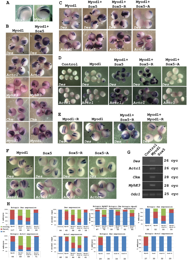 Fig. 1. Sox5 enhances muscle gene expression and acts as a transrepressor in Myod1-induced myogenic transcription assay. (A) In situ hybridization experiments of Sox5 and Myod1 at stage 18 show that Sox5 is expressed at dorsomedial and ventrolateral region of the somites like Myod1. Lateral views. The anterior side of the embryos is on the left. (B) Whole-mount in situ hybridization of embryos unilaterally injected with 100 pg of synthetic mRNAs coding for Myod1 alone or co-injected with Sox5 (400 pg), fixed at stages 17/18 and probed with Des, Actc1, MyhE3, Ckm and endogenous Myod1. (C) Embryos were injected unilaterally either with Myod1 synthetic mRNA alone (100 pg), or co-injected with Sox5, Sox5-R or Sox5-A (400 pg each), fixed at neurula stage and submitted to in situ hybridization for Des and Actc1. (D) Same experiments as in (C) on animal cap explants. (E) Embryos were injected unilaterally either with Myod1-R synthetic mRNA (400 pg), with Myod1 synthetic mRNA (100 pg) alone or co-injected with Sox5-R or Myod1-R (400 pg each), fixed at neurula stage and probed with Des. The arrowhead indicates ectopic expression. Probe is shown in the bottom right corner of each panel. (F) Embryos were injected unilaterally either with Myod1 synthetic mRNA (100 pg), Sox5, Sox5-R or Sox5-A (400 pg each), fixed at neurula stage and submitted to in situ hybridization for Des and Actc1. (G) Expression of Des, Actc1, Ckm, and MyhE3 determined by semi-quantitative RT-PCR from RNA extracted of animal cap explants. Embryos were bilaterally injected with Myod1 synthetic mRNA (100 pg) or with Sox5. Number of PCR cycles was indicated on the left. (H) Bar graph showing percentage of embryos with no, faint or strong ectopic expression. Chi-squared test analysis for ectopic Des expression: Myod1 versus Sox5 (P value< 0,0001), Sox5-R (P value< 0,0001), Sox5-A (P value< 0,0001), for ectopic Actc1 expression: : Myod1 versus Sox5 (P value< 0,0001), Sox5-R (P value< 0,0001), Sox5-A (P value< 0,0001), for ectopic MyhE3 expression: Myod1 versus Sox5 (P value< 0,0001), for ectopic Ckm expression: Myod1 versus Sox5 (P value< 0,0001), for ectopic Myod1 expression: Myod1 versus Sox5 (P value< 0,0002), for Des expression in animal caps: Myod1 versus Sox5 (P value= 0,0228), Sox5-R (P value< 0,0001), Sox5-A (P value< 0,0001), for ectopic Actc1 expression in animal cap: Myod1 versus Sox5 (P value< 0,0001), Sox5-R (P value< 0,0001), Sox5-A (P value= 0,0140), for ectopic Des expression of Myod1-R construct: Myod1 versus Sox5EF (P value= 0,0110), Myod1-R (P value= 0,0011). Numbers of injected embryos are indicated at the bottom of each bar.