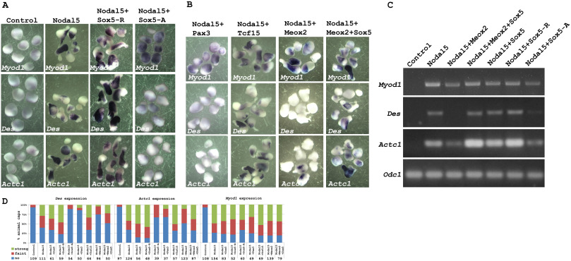 Fig. 4. Sox5 enhances myogenic differentiation and antagonizes the inhibitory effect of Meox2 in Nodal5-induced cap animal assays. (A) In situ hybridization experiments show ectopic expression of endogenous Myod1, Des and Actc1 in animal cap explants of embryos bilaterally injected either with Nodal5 synthetic mRNA alone (50 pg), or co-injected with Sox5-R or Sox5-A(400 pg each). (B) Same experiments from embryos co-injected with Nodal5 synthetic mRNA alone (50 pg) plus Pax3, plus Tc15, plus Meox2, and finally plus both Meox2 and Sox5 (400 pg each). Probe is shown in the bottom right corner of each panel. (C) Expression of endogenous Myod1, Des and Actc1 determined by semi-quantitative RT-PCR at 28 cycles from RNA extracted of animal cap explants. Embryos were bilaterally injected with Nodal5 synthetic mRNA (50 pg) alone or co-injected with Meox2, Meox2 plus Sox5, Sox5, Sox5-R or Sox5-A (400 pg each). (D) Bar graph showing percentage of embryos with no, faint or strong expression. Chi-squared test analysis for Des expression: Nodal5 versus Sox5 ns, Sox5-R (P value = 0,0424), Sox5-A (P value< 0,0001), Pax3 (P value< 0,0001), Tcf15 ns, Meox2 (P value< 0,0001), Nodal+Meox2 versus Nodal+Meox2+Sox5 (P value = 0,0014), for Actc1 expression: Nodal5 versus Sox5 (P value = 0,0184), Sox5-R (P value = 0,0170), Sox5-A (P value< 0,0001), Pax3 (P value = 0,0004), Tcf15 ns, Meox2 (P value< 0,0001), Nodal+Meox2 versus Nodal+Meox2+Sox5 (P value< 0,0001), for Myod1 expression: Nodal5 versus Sox5 ns, Sox5-R ns, Sox5-A ns, Pax3 (P value = 0,0379), Tcf15 ns , Meox2 ( P value = 0,0374). Numbers of injected embryos are indicated at the bottom of each bar.