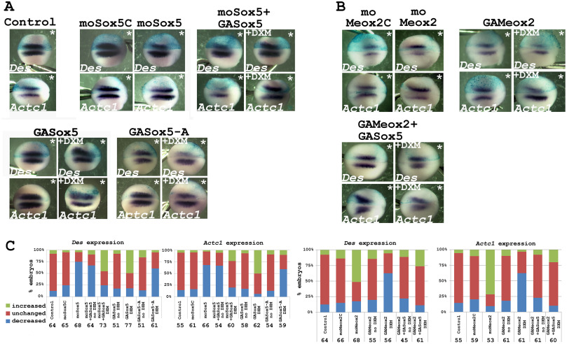 Fig. 6. Sox5 inducible protein rescues myogenic differentiation in Sox5 morphants and antagonizes Meox2 protein during myotome formation. (A) Embryos were injected unilaterally with 5 ng of moSox5 and then were submitted to in situ hybridization with Des and Actc1 antisense probe at the stage 18/19. Des and Actc1 labelling were compared to β-galactosidase control and moSox5C injected embryos. A co-injection of GAsox5 mRNA (200 pg) after induction by DXM at stage 13, with moSox5 was able to rescue the phenotype of moSox5 injected embryos. Unilateral injection of GASox5 and DXM induction produced an increase of Des and Actc1 mRNA whereas injection of GASox5-A and DXM induction led to a decrease of muscle markers. (B) Embryos were injected unilaterally with 10 ng of moMeox2 and then were submitted to in situ hybridization with Des and Actc1 antisense probe at the stage 18/19. Des and Actc1 labelling were compared to β-galactosidase control and moMeox2C injected embryos Unilateral injection of either GAMeox2 (200 pg) induced a decrease of Des and Actc1 mRNA expression at the neurula stage after induction by DXM at stage 13. A co-injection with GASox5 mRNA (200 pg) was able to antagonize the effects of GAMeox2 and rescue the phenotype of injected embryos. Induction by 10 µM dexamethasone (+DXM). Dorsal view and anterior side on the right. β-galactosidase mRNA (blue) was co-injected to identify the injected side, indicated by an asterisk (*). Control, β-galactosidase mRNA alone. Probe is shown in the bottom right corner of each panel. (C) Embryos scored for moSox5, inducible proteins GAsox5 and GASox5-A. Kruskall Wallis test and Dunnâs multiple comparisons test revealed significant difference between moSox5C and moSox5, moSox5+GASox5 and moSox5+GASox5+DXM, GASox5 and GASox5+DXM, GASox5-A and GASox5-A+DXM for both Des and Actc1 expression. Number of embryos injected above each bar. Embryos scored for moMeox2 and inducible proteins GAMeox2. Kruskall Wallis test and Dunnâs multiple comparisons test revealed significant difference between moMeox2C and moMeox2, GAMeox2 and GAMeox2+DXM, GAMeox2+DXM and GAMeox2+GASox5+DXM for both Des and Actc1 expression. Numbers of injected embryos are indicated at the bottom of each bar. The same β-galactosidase control is used for moSox5 and moMeox2.