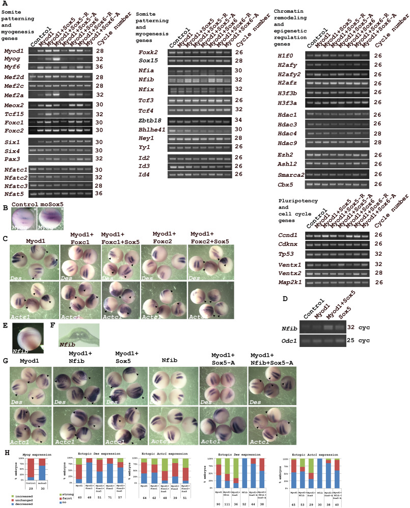 Fig. 7. Sox5 increases late myogenic regulators in Myod1-induced myogenic transcription assay. (A) Expression of more than 50 genes determined by semi-quantitative RT-PCR from RNA extracted of animal cap explants. Embryos were bilaterally injected with MyodF synthetic mRNA (100 pg) alone or co-injected with Sox5, Sox5-R, Sox5-A, Sox6, Sox6-R or Sox6-A (400 pg each). Number of PCR cycles was indicated on the left. (B) Embryos were injected unilaterally with 5 ng of moSox5 and then were submitted to in situ hybridization with Myog antisense probe at the stage 19/20. Myog labelling were compared to β-galactosidase control injected embryos. Dorsal view and anterior side on the right. β-galactosidase mRNA (blue) was co-injected to identify the injected side, indicated by an asterisk (*). Control, β-galactosidase mRNA alone. Probe is shown in the bottom right corner of each panel. (C) Embryos were injected unilaterally either with Myod1 synthetic mRNA (100 pg) alone or co-injected with Foxc1, Foxc1 plus Sox5, Foxc2, Foxc2 plus Sox5 (400 pg each), fixed at neurula stage and probed with Des and Actc1. (D) Expression of Nfib determined by semi-quantitative RT-PCR from RNA extracted of animal cap explants. Embryos were bilaterally injected with Myod1 synthetic mRNA (100 pg), Sox5, (400 pg) or both. Number of PCR cycles was indicated on the left. (E) In situ hybridization experiments showing Nfib expression in lateral view at stage 20, anterior side on the right. (F) transversal section showing Nfib expression in somites. (G) Embryos were injected unilaterally either with Nfib (400 pg), Myod1 synthetic mRNA (100 pg) alone or co-injected with Nfib, Sox5-A, Nfib plus Sox5-A, (400 pg each), fixed at neurula stage and probed with Des and Actc1. (H) Bar graph showing percentage of embryos with no, faint or strong expression (Des and Actc1) and with decreased,unchanged or increased expression (Myog). Chi-squared test analysis for Des expression: Myod1 versus Myod1+Foxc1 (P value = 0,0001), Myod1+Foxc1+Sox5 (P value = 0,0005), Myod1+Foxc2 (P value< 0,0001), Myod1+Foxc2+Sox5 (P value< 0,0001), Myod1+Foxc1 versus Myod1+Foxc1+Sox5 (P value = 0,0006), Myod1+Foxc2 versus Myod1+Foxc2+Sox5 (P value = 0,0021), Myod1 versus Myod1+Nfib (P value = 0,0001), Myod1+Sox5 (P value = 0,0001), Myod1+Sox5-A (P value< 0,0001), Myod1+Sox5-A versus Myod1+Sox5-A+Nfib (P value< 0,028), for Actc1 expression: Myod1 versus Myod1+Foxc1 ns, Myod1+Foxc1+Sox5 (P value = 0,0001), Myod1+Foxc2 ns, Myod1+Foxc2+Sox5 (P value< 0,0009), Myod1+Foxc1 versus Myod1+Foxc1+Sox5 (P value = 0,0424), Myod1+Foxc2 versus Myod1+Foxc2+Sox5 (P value = 0,049), Myod1 versus Myod1+Nfib (P value = 0,0007), Myod1+Sox5 (P value = 0,0001), Myod1+Sox5-A (P value< 0,0055), Myod1+Sox5-A versus Myod1+Sox5-A+Nfib (P value< 0,036). Chi-squared test analysis for Myog expression: Control versus moSox5 (P value< 0,0001). Numbers of injected embryos are indicated at the bottom of each bar.