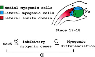 Fig. 8. Schematic diagram of Sox5 action inXenopusmyotome. Sox5 accumulates in the somites at late neurula stage in dorso and ventro-lateral regions where myogenic differentiation takes place. Sox5 enhances indirectly myogenic transcription by acting as a transcriptional repressor on putative inhibitors of myogenesis.