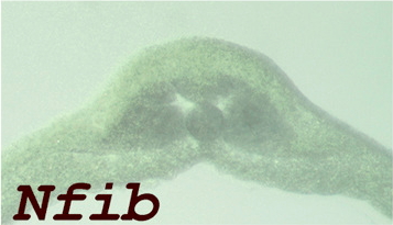nfib (nuclear factor I B) gene expression in Xenopus laevis embryo, assayed via in situ hybridization, NF stage 20, lateral view, anterior left, dorsal up.