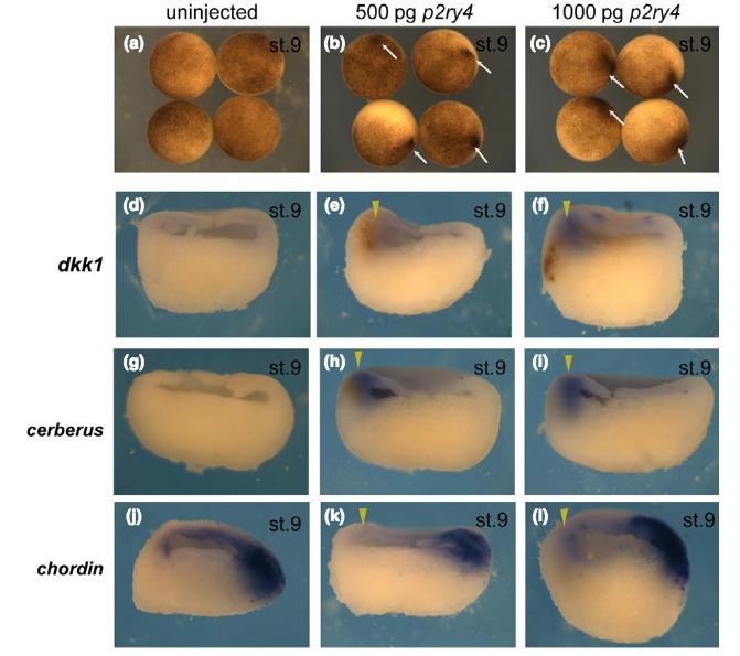 Vertebrates have unique head structures that are mainly composed of the central nervous system, the neural crest, and placode cells. These head structures are brought about initially by the neural induction between the organizer and the prospective neuroectoderm at early gastrula stage. Purinergic receptors are activated by nucleotides released from cells and influence intracellular signaling pathways, such as phospholipase C and adenylate cyclase signaling pathways. As P2Y receptor is vertebrate-specific and involved in head formation, we expect that its emergence may be related to the acquisition of vertebrate head during evolution. Here, we focused on the role of p2ry4 in early development in Xenopus laevis and found that p2ry4 was required for the establishment of the head organizer during neural induction and contributed to head formation. We showed that p2ry4 was expressed in the head organizer region and the prospective neuroectoderm at early gastrula stage, and was enriched in the head components. Disruption of p2ry4 function resulted in the small head phenotype and the reduced expression of marker genes specific for neuroectoderm and neural border at an early neurula stage. Furthermore, we examined the effect of p2ry4 disruption on the establishment of the head organizer and found that a reduction in the expression of head organizer genes, such as dkk1 and cerberus, and p2ry4 could also induce the ectopic expression of these marker genes. These results suggested that p2ry4 plays a key role in head organizer formation. Our study demonstrated a novel role of p2ry4 in early head development.