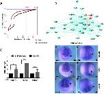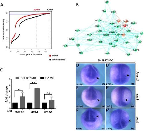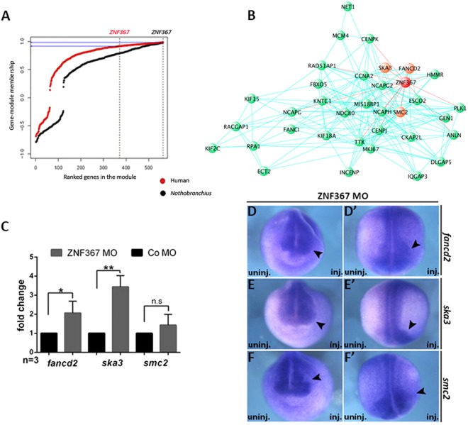 Figure 6. Network and molecular analysis of znf367 neighbors. (A) Distribution of membership values for the analyzed module in human cells and N. furzeri brain. The vertical line indicates the rank of znf367 and the horizontal line its membership value (black for N. furzeri and red for H. sapiens). Please note due to the high convexity of the human distribution ZNF367 has very high membership despite its rank. (B) Central part of the gene module containing ZNF367. Only genes showing topological overlap >0.3 are shown. ZNF367 is in red, while genes used for further analysis are in orange (SMC2, SKA3 and FANCD2). (C) qRT-PCR analysis of fancd2, ska3 and smc2. The levels of expression for the indicated mRNAs were evaluated for Co-MO or ZNF367-MO populations by qRT-PCR in triplicate and normalized to, glyceraldehyde 3-phosphate dehydrogenase (gapdh) expression. (D) mRNA distribution of fancd2, ska3 and smc2 in znf367 morphants. Neurula stage embryos are shown in frontal (D,E,F) and dorsal view (Dâ,Eâ,Fâ). Arrowheads indicated the expanded domain of the mRNA distribution of each gene in the injected side of the embryo. Abbreviations: n, number of independent experiments; Error bars indicate standard error of the means (s.e.m); n.s., not significant. *pââ¤â0,05; **pââ¤â0,01. P-value were calculated by Studentâs T-test.