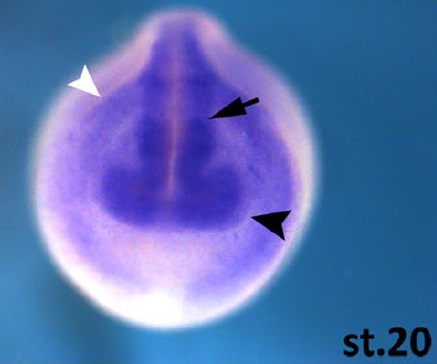 znf367(zinc finger protein 367) gene expression in Xenopus laevis embryo, assayed via in situ hybridization, NF stage 20, dorsal view, anterior down
