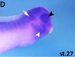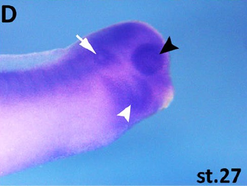 znf367(zinc finger protein 367) gene expression in Xenopus laevis embryo, assayed via in situ hybridization, NF stage 27, lateral view, anterior right, dorsal up.