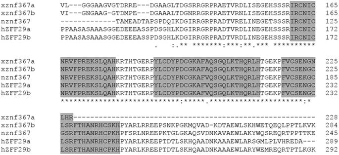 Figure 1. Multiple sequence alignments of znf367 amino acid sequences. The gray boxes highlighted the conserved zinc-fingers binding domains of znf367 from X. laevis (both splicing variants znf367a and znf367b), human (both splicing variants ZFF29a and ZFF29b) and N. furzeri (n) obtained using Clustal Omega.