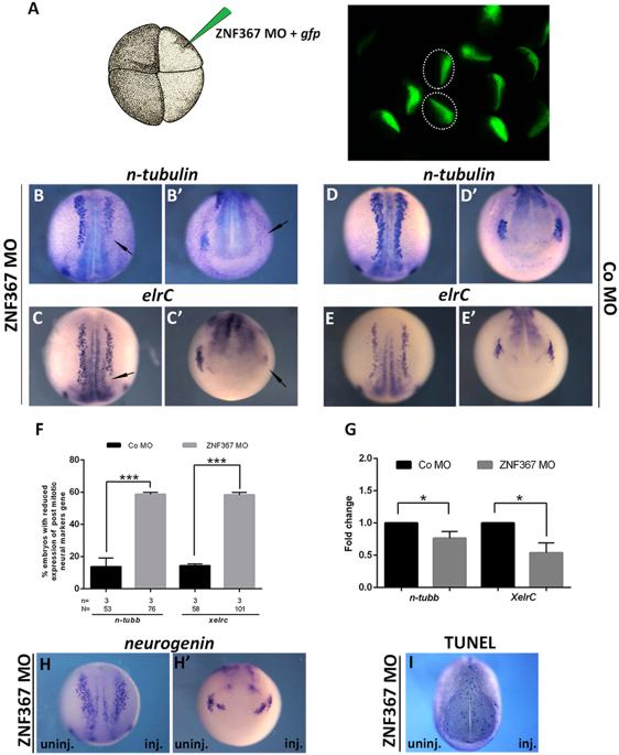 Figure 3. Loss of znf367 function interferes with the expression of neuronal differentiation markers. (A) Embryos injected with gfp (250âpg) and either ZNF367-MO or Control morpholino (Co-MO) (9âng) at one dorsal blastomere at the four-cells stage showed fluorescence only in the neural plate at neurula stage (st. 18). (BâEâ) mRNA distribution of N-tubulin and elrC in znf367 morphants and controls. (B,C) dorsal view and (Bâ,Câ) frontal view of neurula morphants showing a clear loss of differentiation markers expression in primary neurons (arrows). (D,E) dorsal view and (Dâ,Eâ) frontal view of neurula embryos injected with Co-MO. (F) Quantification of the data in A and B. (G) qRT-PCR analysis. The levels of expression for the indicated mRNAs were evaluated for Co-MO or ZNF367-MO populations by qRT-PCR, and normalized to that of the housekeeping gene, glyceraldehyde 3-phosphate dehydrogenase (gapdh) expression. The mean of the Control-MO was set to 1. For each gene, three independent RNA samples from morphants and controls were analysed. (HâHâ) mRNA distribution of neurogenin in znf367 morphants. (I) TUNEL staining. ZNF367-MO injection did not lead to an increase of TUNEL positive cells compared to the un-injected side. Abbreviations: n, number of independent experiments; N, number of evaluate embryos in total; Error bars indicate standard error of the means (s.e.m); *pââ¤â0,05; ***pââ¤â0,001. P-value were calculated by Studentâs t-test.