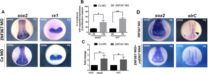 Figure 4. znf367 morphants analysis and control rescue experiments. (A) mRNA distribution of sox2 and rx1 in znf367 morphants and controls. (B) Statistical analysis of the data in A. (C) The levels of expression for the indicated mRNAs were evaluated for Co-MO or ZNF367-MO populations by qRT-PCR, and normalized to that of the housekeeping gene, glyceraldehyde 3-phosphate dehydrogenase (gapdh) expression, and the mean of the Control-MO was set to 1. For each gene, three independent RNA samples from morphants and controls were analysed. (D) The morphants phenotype can be rescued by the co-injection of morpholino plus full length Xenopus znf367 mRNA as shown by the recovered expression of sox2 and elrC. Abbreviations: n, number of independent experiments; N, number of evaluated embryos in total; Error bars indicate standard error of the means (s.e.m); *pââ¤â0,05; **pââ¤â0,01. P-value were calculated by Studentâs t-test.