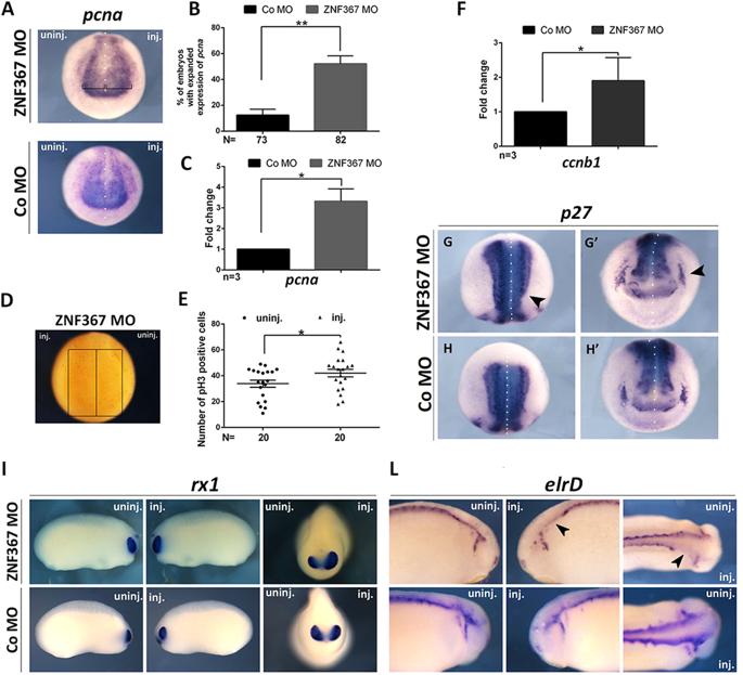 Figure 5. znf367 morphants analysis for proliferating and differentiating precursors (A) mRNA distribution of pcna in znf367 morphant and control. (B) Statistical analysis of the data in A. (C) RT-PCR analysis revealed a significant increase of pcna. (D,E) Znf367 depletion leads to a significant reduction of proliferating cells compared to the un-injected side. pH3 positive cells were counted in the areas defined by the black rectangles. Statistical evaluation of the data is shown (E). (F) RT-PCR analysis of cyclinB1 (ccnb1). The levels of expression for the indicated mRNAs were evaluated for Co-MO or ZNF367-MO embryos by qRT-PCR in triplicate, and normalized to glyceraldehyde 3-phosphate dehydrogenase (gapdh) expression. (GâGâ) p27 is down regulated at stage 18 in znf367 morphants (arrowheads). (G) dorsal view; (Gâ) frontal view. (HâHâ). p27 expression in control embryo, (H) dorsal view; (Hâ) frontal view. (IâL) rx1 and elrD expression at tailbud stages confirmed the phenotype observed at neurula stages: increased expression of rx1 and downregulation of a neuronal differentiation marker (elrD) (arrowheads). Abbreviations: n, number of independent experiments; N, number of evaluated embryos in total; Error bars indicate standard error of the means (s.e.m); *pââ¤â0,05; **pââ¤â0,01. P-value were calculated by Studentâs T-test.