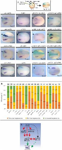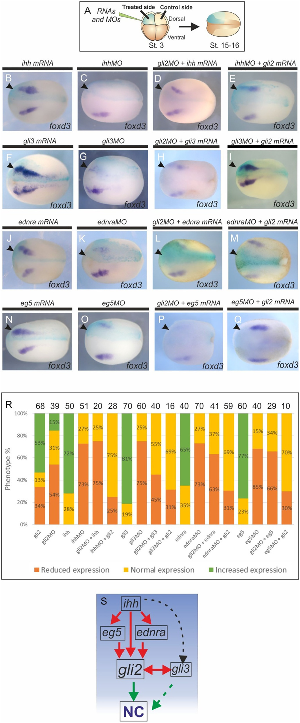 Fig. 10. gli2 epistatic relationships with ihh, gli3, ednra and eg5. (A) Schematic representation of the experiments performed. (BâQ) Dorsal views of Xenopus laevis embryos at mid-neurula stage; anterior side is on the left. Arrowheads indicate the injected side, shown in turquoise. The images show combinatorial experiments performed to evaluate the epistatic relationship between gli2 and different genes involved in the gene regulatory network that induces the NC. They also show the effect of individual genes on the NC. (BâE) gli2 is downstream of ihh during NC induction. (FâI) gli2 and gli3 rescue each other's deficiency during NC induction. (JâQ) Both genes ednra and eg5 act upstream of the gli2 transcription factor during NC induction and specification. (R) Quantification of the phenotypes shown in BâQ. (S) Hierarchy diagram plotting the epistatic relationships between the genes analyzed.