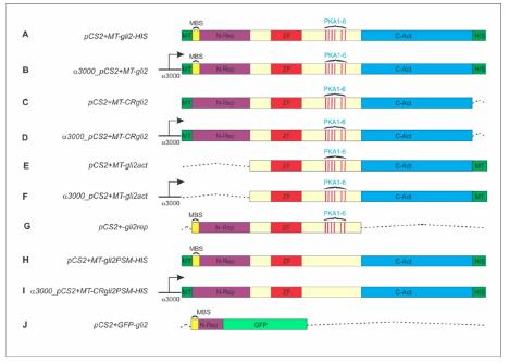 Figure S1. Graphic representation of gli2 constructs used in the functional studies. (A) pCS2+MT-gli2-HIS: construct encoding the full-length Xenopus gli2 construct. (B) 3000_pCS2+MT-gli2: construct encoding gli2 full-length, which only is expressed in the NC. (C) pCS2+MT-CRgli2: construct encoding the full-length gli2 protein in which the morpholino binding sequence is altered so that gli2MO can no longer bind to the protein. (D) 3000_pCS2+MT-CRgli2: CRgli2 construct, specifically designed to be expressed in the NC. (E) pCS2+MT-gli2act: Activator form of gli2, without the repressor region. (F) 3000_pCS2+MT-gli2act: gli2act construct with expression only in the NC. (G) pCS2+MT-gli2rep: Repressor form of gli2, without the activator region. (H) pCS2+MT-gli2PSM-HIS: Construct with PKA-sites mutated. (I) 3000_pCS2+MT-CRgli2PSM: gli2PSM expressed only in NCC. (J) pCS2+GFP-gli2: Short region of gli2 fused to the GFP protein. MT: myc tag; MBS: Morpholino binding site; MBS: Codon replacement in the Morpholino binding site; N-Rep: N-terminal repressor domain (1044 bp); ZF: Zinc fingers domain; PKA1-6: Conserved PKA (protein kinase A) phosphorylation sites 1 to 6; C-Act: C-terminal activator domain (3519bp).