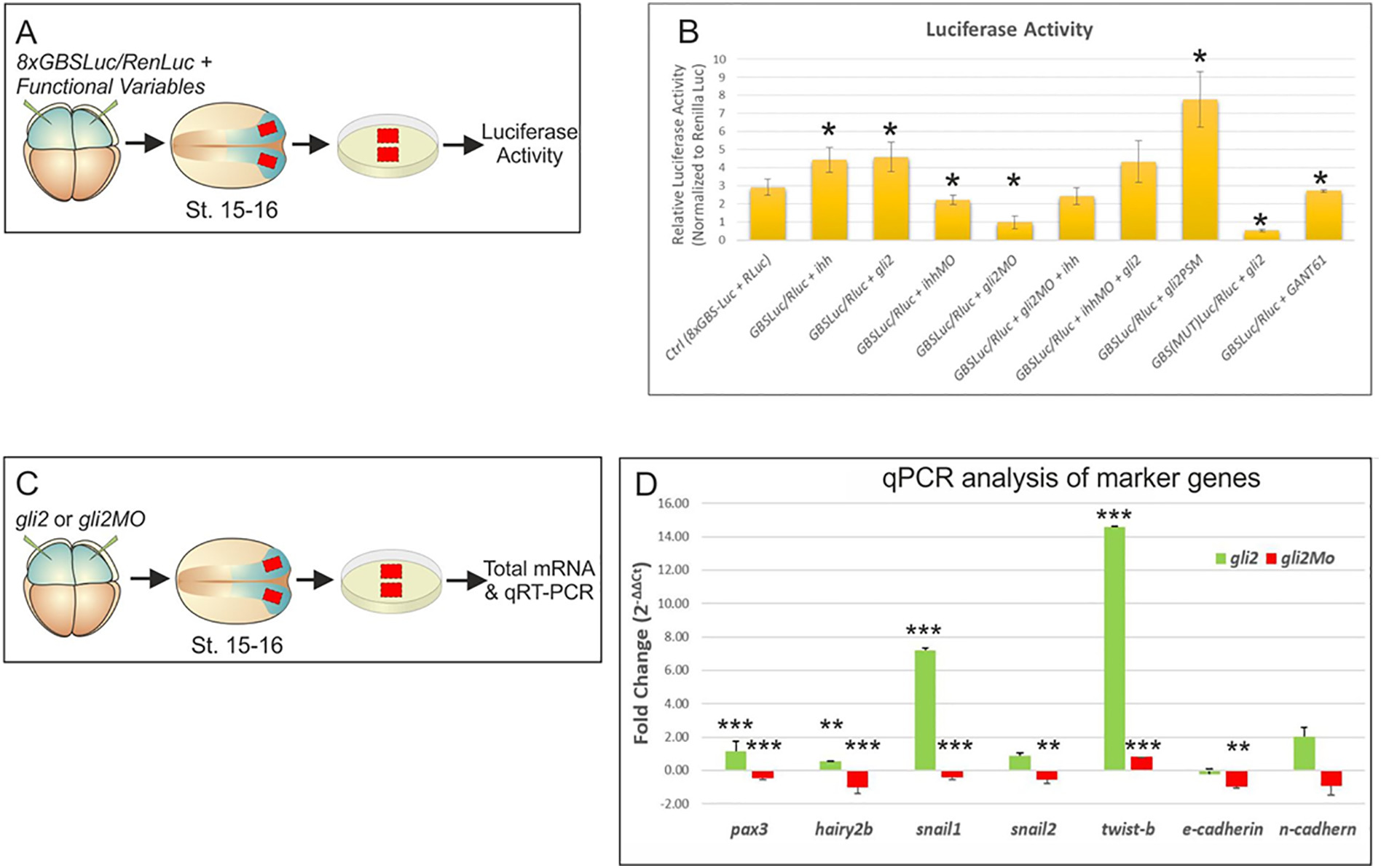 Fig. 6. gli2 acts through a transcriptional activation mechanism and affects the expression of several NC markers. (AâB) Gli-Luciferase reporter assay. (A) Schematic representation of the Luciferase assay experiment. (B) Transcriptional activity of Gli2 in NC explants. Intensities are shown as relative units of Luciferase normalized to the internal control Renilla Luciferase. An increase in Gli2 and Ihh function increases the expression of the Gli-dependent reporter construct. (C-D) RT-qPCR analysis of Gli2 function on the expression of NPB and NC markers. Each color coded bar represents the relative expression level of the markers for each condition (gain and loss-of-function of gli2). All the expression levels denote Ct values that were normalized first to the expression level of gadph, and then they were normalized to the expression of each gene in the uninjected wildtype condition, and are presented as fold change. (C) Schematic representation of the grafting experiment. At stage 15â16 total RNA was isolated and then RT-qPCR was performed. (D) Expression levels of the markers pax3, hairy2b, snail1, snail2, twist-b, e-cad and n-cad. Data are presented as meanâ¯Â±â¯s.d. of triplicates of two independent qPCR experiments. Reference: **, Pâ¯<â¯0.05; ***, Pâ¯<â¯0.001 (P-values correspond to Student's t-Test).