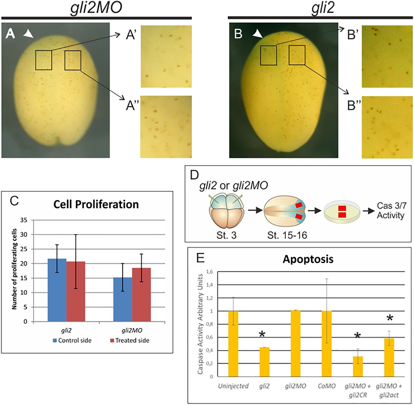 Fig. 7. gli2 is involved in the apoptosis of NCC but not in their proliferation. (AâB) Dorsal views of Xenopus laevis embryos, anterior side to the top. White arrowheads indicate the injected side. Gain- and loss-of-function of gli2 did not alter the number of proliferating cells between the injected and the control side. (Aâ², Aâ², Bâ², Bâ²) Insets showing the quantified area of each embryo. (C) Quantification of proliferating cells in the embryos treated with gli2 mRNA or gli2MO. (D) Schematic diagram showing the approach used to evaluate the apoptosis status of NCC. (E) Graph showing that the overexpression of gli2 prevents NCC from undergoing normal apoptosis. The inhibition of gli2 expression did not produce any significant changes in the apoptosis level of NCC. The activator form of Gli2 also decreased apoptosis in NC explants. Values are meanâ¯Â±â¯s.d. from two independent experiments. Pâ¯â¤â¯0.05 (Student's t-test).