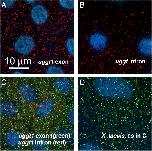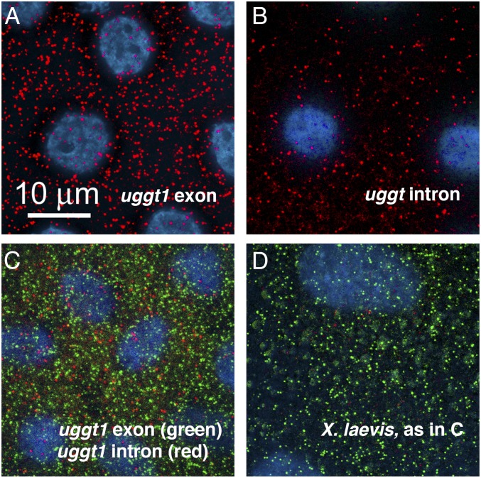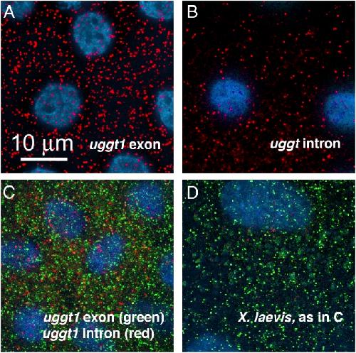 Single-molecule in situ hybridization of exon and intron probes from the X. tropicalis uggt-1 gene. Oocytes (200â400 µm diameter) were hybridized and examined as whole mounts. Images are deconvolved stacks extending from the follicle cells (blue nuclei, DAPI stain) surrounding the oocyte into the peripheral cytoplasm of the oocyte. All of the signal is in the oocyte itself. (A) X. tropicalis oocyte hybridized against the uggt-1 exon probe (red). (B) X. tropicalis oocyte hybridized against the uggt-1 intron probe (red). (C) X. tropicalis oocyte hybridized against both the exon probe (green) and the intron probe (red). The two probes give nonoverlapping signals. (D) X. laevis oocyte hybridized with both probes, as in C. Only the green exonic probe gives a positive signal in this species. Oocytes were fixed in 4% paraformaldehyde and hybridized according to the protocol supplied by the probe manufacturer (Stellaris probes from LGC Biosearch Technologies).