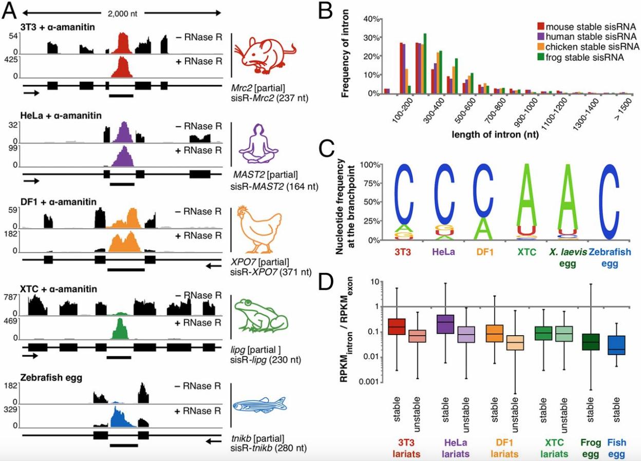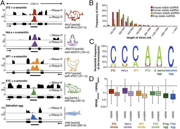 Fig. 2. Identification of lariat RNAs in five vertebrate species. (A) A typical prominent sisRNA detected in cultured cells of mouse (red), human (purple), chicken (orange), and frog (green) and zebrafish eggs (blue). RNase R was used to eliminate mRNA transcripts (black). Transcript annotation and orientation are shown below the coverage for each gene. (B) Percent of stable circular RNAs as a function of intron length (50-nt bins). Mouse (red), human (purple), chicken (orange), frog (green), and zebrafish (blue) sisRNAs derive from short introns. (C) Nucleotide frequency at the branchpoint of stable lariats. (D) Abundance of “stable” and “unstable” circular intronic RNA relative to their cognate mRNA in untreated cells.
