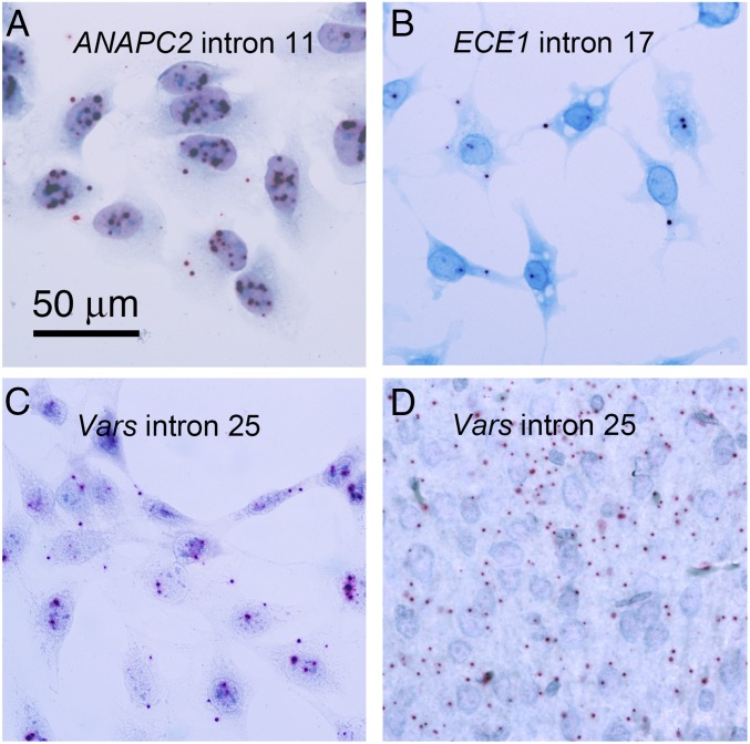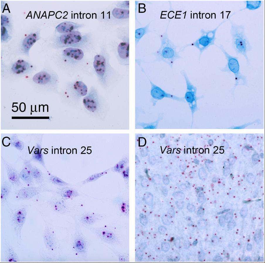 Fig. 3. Single-molecule in situ hybridization of introns. (A) Human ANAPC2 intron 11 in cultured human cells (HeLa). (B) Chicken ECE1 intron 17 in cultured chicken cells (DF1). (C) Mouse Vars intron 25 in cultured mouse cells (3T3). (D) Mouse Vars intron 25 in section of mouse hind brain. Tissues were fixed in 4% paraformaldehyde and hybridized according to the protocol supplied by the probe manufacturer (Advanced Cell Diagnostics).