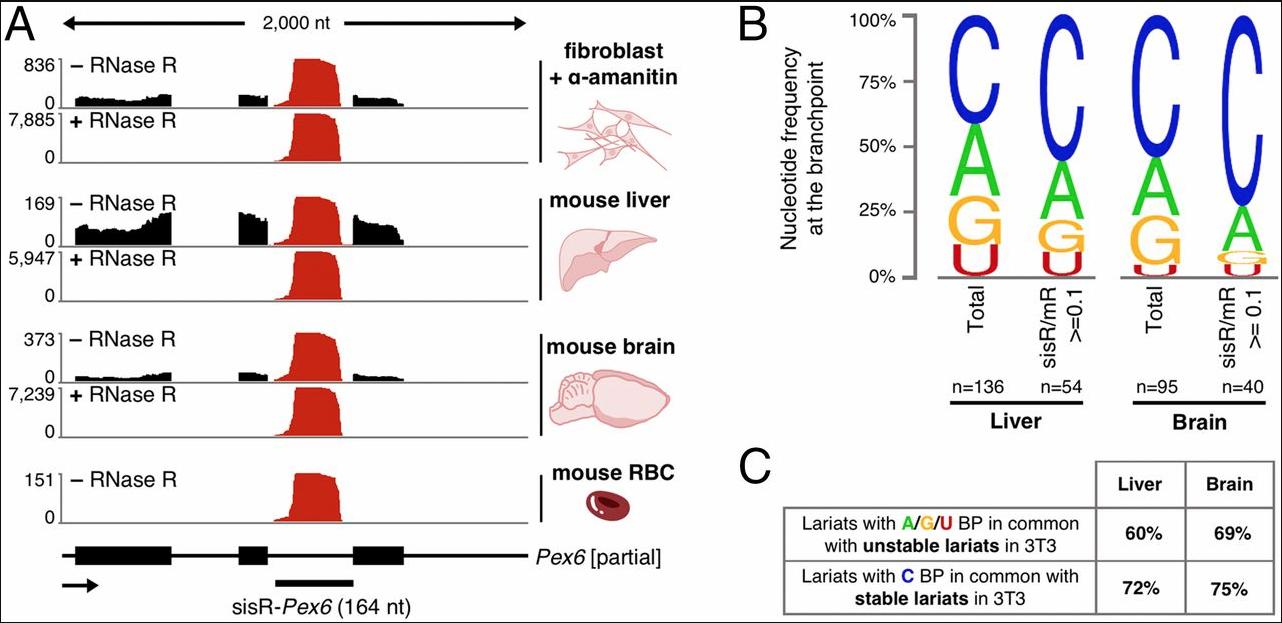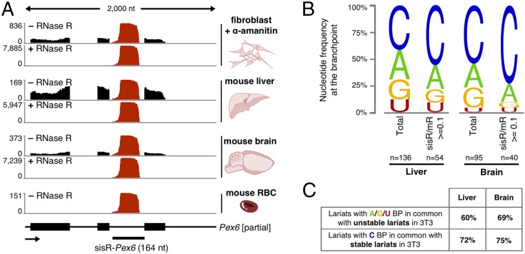 Fig. 4. SisRNAs in various mouse tissues. (A) A very abundant sisRNA, sisR-Pex6 (red), is detected in fibroblasts, liver, brain, and RBCs. (B) Branchpoint nucleotide frequency of all lariats detected in liver and brain. ânâ represents the number of mapped branchpoints. (C, Upper) Lariats with A, G, and U branchpoints in common with lariats detected in control 3T3 cells and (Lower) lariats with C branchpoint in common with lariats detected in α-amanitinâtreated 3T3 cells.