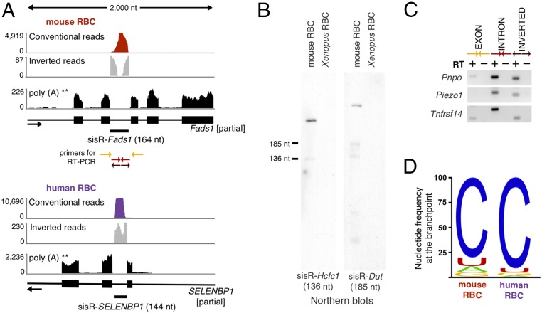 Fig. 1. Typical sisRNAs found in mouse and human RBCs. (A) The two Upper tracks show conventional reads (red and purple) and inverted reads (gray) of total RNA from mature RBCs. The Lower tracks correspond to public RNA sequencing data of polyadenylated transcripts from RBC precursor cells (erythroblasts) (11). (B) Northern blots against two mouse stable lariats. In each case, the major band ran slower than expected for a linear molecule, consistent with the circular nature of the intronic RNA. (C) RT-PCR using conventional exonic (yellow) and intronic primers (red). Mouse RBC intronic RNAs can be amplified with the conventional (red) as well as inverted (outward facing) primers (brown), consistent with the RNAs being circular. (D) Nucleotide frequency at the branchpoint for all 374 mouse and 99 human stable lariats.