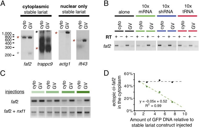 Fig. 6. (A) Northern blots against two cytoplasmic and two nuclear X. tropicalis sisRNAs expressed ectopically in X. laevis. Red stars mark circular transcripts. The gray star marks the linearized sisR-faf2, and the black star marks the unprocessed intronic RNA trappc9. (B) RT-PCR against sisR-faf2 on cytoplasmic and nuclear fractions. Oocytes were injected with a sisR-faf2 intron construct alone (black) or with GFP DNA (mRNA, green), an shRNA construct (blue), and a tRNA construct (red). All 16 lanes were run on the same gel. After imaging, the lanes were cut (digitally) and rearranged to give the final panel. (C) Upper lanes: increasing amounts of GFP DNA were injected into the nucleus along with the sisR-faf2 intron construct. The amount of cytoplasmic sisR-faf2 decreases as more GFP DNA is injected. Lower lanes: coinjection of nxf1 DNA along with the sisR-faf2 intron construct rescues the cytoplasmic accumulation of sisR-faf2. The samples were run on nonadjacent lanes on one gel. (D) Semiquantitative analysis of the RT-PCR shown in C.