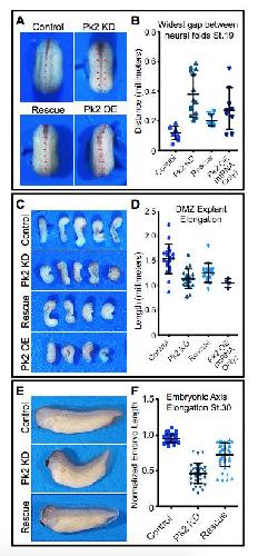 Figure 1âfigure supplement 2. Pk2 knockdown results in embryonic convergent extension phenotypes.(A) Dorsal view: stereoscope images of a representative Stage 20 control embryo, an embryo that has been injected dorsally with 25 ng Pk2 morpholino, an embryo that received morpholino plus a 400 pg GFP-Pk2 mRNA rescue dose, and an embryo that received only the 400 pg Pk2 mRNA. Anterior is up. (B) Graph of the distance between the neural folds at stage 20. n = 8 (Control), 14 (Pk2 KD), 8 (Rescue), 9 (RNA/OE). Control vs. KD, p<0.0001; vs. Rescue, p=0.0019; vs. OE, p=0.0079. (Mann-Whitney Test for significance). Error bars represent standard deviation. (C) Images of Dorsal marginal zone (DMZ) explants dissected from stage 11.5 embryos of the treated under the same conditions as in (A). (D) Graph of DMZ explant length at a time when embryos that had not been dissected had reached Stage 20. n = 19 (Control), 19 (Pk2 KD), 16 (Rescue), 4 (RNA/OE). Control vs. KD, p<0.0001; vs. Rescue, p=0.0010; vs. OE, p=0.0041. (Mann-Whitney Test for significance). Error bars represent standard deviation. (E) Representative images of Stage 30 embryos that received 30 ng Pk2 morpholino, morpholino plus 400 pg rescue GFP-Pk2 mRNA, or controls that received neither. Anterior is left and dorsal is up. (F) Graph of the length of the dorsal embryonic length of embryos represented by those shown in (E). n = 35 (Control), n = 37 (Pk2 KD), n = 44 (Rescue). Control vs. KD, p<0.0001; vs. Rescue, p<0.0001. (Mann-Whitney Test for significance). Error bars represent standard deviation. |