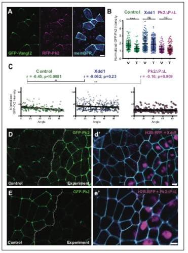 Figure 1. Planar polarized localization of Prickle2 and Vangl2 in the neural plate. (A) Neural epithelium mosaically labeled with GFP-Vangl2, RFP-Pk2, and membraneBFP showing the overlapping localizations of Pk2 and Vangl2. Anterior is up, and scale = 10 mm. (B) Graph plotting GFP-Pk2 intensity along V-junctions (0â45 Ì relative to mediolateral axis) and T-junctions (46â90 Ì relative to mediolateral axis) normalized as a ratio to the mean cytoplasmic intensity in control cells and cells expressing Xdd1 and Pk2-DPDL. Error bars represent standard deviation. Ctrl V vs. T, p<0.0001***; Xdd1 V vs. T, p=0.5799; Pk2-DPDL V vs. T, p=0.173; Ctrl V vs. Xdd1 T, p=0.5770; Ctrl T vs. Pk2-DPDL V, p=0.0268 (Mann Whitney test for significance). n = 101 V and 71 T from three experiments, seven embryos (Ctrl); n = n = 171 V and 199 T from four experiments, five embryos (Xdd1); n = 128 V and 142 T from three experiments, seven embryos (Pk2-DPDL). (C) Distributions of data shown in (B) plotted against the angle of the junction at which the intensity was measured. Correlation coefficients for Xdd1 and Pk2-DPDL were significantly different from controls using the Fischer R-to-Z transformation. n = 172 junctions (Control), n = 263 junctions (Xdd1) and n = 245 junctions (Pk2-DPDL) (D-E) Confocal images of Xenopus neural epithelia labeled evenly with GFP-Pk2 and membraneBFP and mosaically with H2B-RFP, serving as a tracer for either Xdd1 (C) or Pk2-DPDL (D) expression. Scale = 10 mm. DOI: https://doi.org/10.7554/eLife.36456.002 |