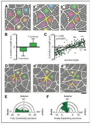 Figure 3. Polarized apical junction dynamics facilitate mediolateral cell intercalations. (A) Confocal images of junction dynamics in the Xenopus neural plate epithelium labeled with membraneGFP. Magenta lines mark the shrinking of a V-junction during a T transition; after complete shrinkage mediolaterally (T1-T2) (a’), a new junction (cyan) elongates perpendicularly along the AP axis (T2-T3) (a’’). Scale = approx. 20 mm. (B) Graph showing the mean change (±s.d.) in junction length for V- and T-junctions. (C) Plot of the average angles of junctions over 1800 s against the change in junction length. Each dot represents on cell-cell junction. n = 267 junctions from three embryos across three different experiments. (D) The simultaneous mediolateral shrinking of two neighboring v- junctions (magenta) leads to formation of a multicellular rosette (d’), and new junctions (cyan) that emerge from the resolving rosette are oriented along the AP axis (d’’). Scale = approx. 20 mm. (E) Rose diagram plotting the orientation of shrinking junctions that lead to the formation of multicellular rosettes and the mean resultant vector (arrow). n = 42 junctions from four embryos across three separate experiments. (F) Rose diagram plotting the orientation of new junctions emerging from resolving rosettes and mean resultant vector (arrow). n = 36 new junctions from 3 embryos across three separate experiments. DOI: https://doi.org/10.7554/eLife.36456.011 |