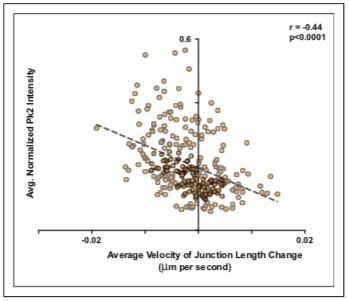 Figure 6—figure supplement 2. Pk2 is more highly enriched at shrinking mediolateral junctions. (A) Plot of average Pk2 intensities normalized to the membrane label intensities at two time points against the change in the length of the junction divided by the time in seconds between the two time points that the measurements were taken. All measurements are taken from V-junctions that remained within 30 degrees of the mediolateral axis throughout the duration of analysis. Junctions that were shrinking at a greater rate tended to have higher levels of normalized Pk2 localized as compared to other V-junctions that were not shrinking at a comparable rate. n = 205 intervals from 22 cells of five embryos across five separate experiments. DOI: https://doi.org/10.7554/eLife.36456.020 |