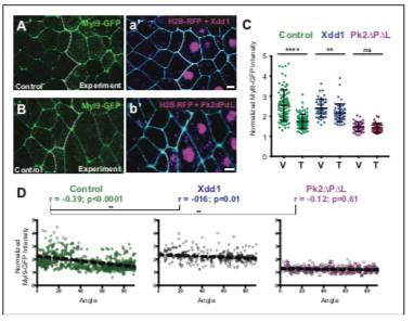 Figure 8. PCP function is required for polarization of actomyosin contractility during junction shrinking. (AâB). Confocal images of Xenopus neural epithelia labeled evenly with Myl9-GFP and membraneBFP and mosaically with H2B-RFP serving as a tracer for either Xdd1 (A) or Pk2-DPDL (B) expression. Scale = 10 mm (C) Graph plotting Myl9-GFP intensity along V-junctions (0â45 Ì relative to mediolateral axis) and T-junctions (46â90 Ì relative to mediolateral axis) normalized as a ratio to the mean cytoplasmic intensity of the cells sharing the junction. Control cells (n = 91 V, 91T) and cells expressing Xdd1 (n = 44 V, 53 T) and Pk2-DPDL (n = 45 V, 45 T). Ctrl V vs. T, p<0.0001****; Pk2-DPDL V vs. T, p=0.2304; Xdd1 V vs. T, p=0.0022**; Control V vs. Xdd1 V, p=0.5826; Control T vs. Xdd1 T, p<0.0001****; Control T vs. Pk2-DPDL T, p<0.0001**** (Mann-Whitney Test for significance). Error bars represent standard deviation. (D) Distributions of normalized Myl9-GFP intensity plotted against the angle of the junction at which intensity was measured in control cells and cells expressing Xdd1 or Pk2-DPDL. Correlation coefficients for Xdd1 and Pk2-DPDL were shown to be significantly different from controls using the Fischer R-to-Z transformation. n = 498 junctions (Control), n = 263 junctions (Xdd1) and n = 245 junctions (Pk2-DPDL) from four experiments, five embryos (Xdd1); three experiments, seven embryos (Pk2-DPDL). DOI: https://doi.org/10.7554/eLife.36456.022 |