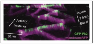 Figure 1—figure supplement 1. GFP-Pk2 localizes to anterior apicolateral regions of cells in the Xenopus neural plate. Pseudo 3D render of neural epithelium mosaically labeled with GFP-Pk2 and membraneRFP showing Pk2 restricted to the apicolateral anterior regions. DOI: https://doi.org/10.7554/eLife.36456.003 |