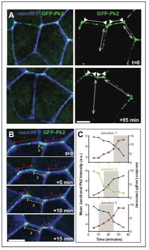 Figure 5. Pk2 is dynamically enriched at shrinking V-junctions. (A) Confocal images of neural epithelial cells labeled with membraneRFP (pseudocolored blue) and GFP-Pk2 showing the change in length of shrinking junctions (inward facing arrowheads) and growing junctions (outward facing arrows) along with the corresponding change in GFP-Pk2 intensity at two different time points. Scale = 10 mm (B) Higher magnification view of the horizontal junctions shown in A, shown at 5-min intervals. Red brackets indicated shrinking junctions; yellow brackets indicate growing junctions. Scale = 10 mm (C) Plots of intensity (red/yellow traces) and length (black dashed traces) for each of the indicated junctions in Panel B. Plots show 30 min of junction dynamics ending in either junction resolution or junction formation and expansion; gray area behind select data points indicate the interval of the four frames shown in (B), which are offset due to different junctions appearing and resolving at different times. DOI: https://doi.org/10.7554/eLife.36456.014 |