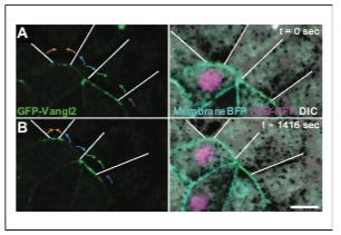 Figure 5—figure supplement 1. Distinct Vangl2 dynamics at adjacent growing and shrinking junctions. (A) Confocal stills of a neural epithelium mosaically labeled with GFP-Vangl2 (left) and co-labeled with H2B-RFP and membraneBFP merged with the DIC image (right). White lines indicate junctions of unlabeled neighboring cells. Colored arrows indicate shrinking (orange, green) or growing (blue, purple) behaviors of adjoined cell-cell junctions. Note dramatic changes of Vangl2 intensity at shrinking junctions only. Scale = 10 mm. DOI: https://doi.org/10.7554/eLife.36456.015 |