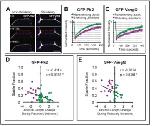 Figure 7. Turnover of Pk2 and Vangl2 correlates with junction behavior. (A) Still images from time-lapse movies captured before and after photobleaching a nonshrinking and shrinking junction of cells mosaically labeled with GFP-Pk2 in the neural plate, with a LUT applied for warmer colors representing higher fluorescence intensities. Dashed red box marks the bleached region of interest. Note that the cell on the anterior side of the junctions is unlabeled. Scale = 5 mm. (B, C) Graphs showing mean fluorescence recovery after photobleaching at shrinking and nonshrinking junctions for GFP-Pk2 (n = 34 nonshrinking, n = 15 shrinking) and GFP-Vangl2 (n = 17 nonshriking, n = 16 shrinking). Shrinking junctions were defined as those that were reduced by 0.5 mm or more in length over the course of bleaching and fluorescence intensity recovery. Error bars represent SEM. (D–E) Graphs plotting the change in junction length during photobleaching and recovery against the calculated nonmobile fraction for the individual junctions analyzed in (B) and (C) with associated linear regression model and correlation analysis statistics included. n = 49 (GFP-Prickle2); n = 33 (GFP- Vangl2). DOI: https://doi.org/10.7554/eLife.36456.021 |
