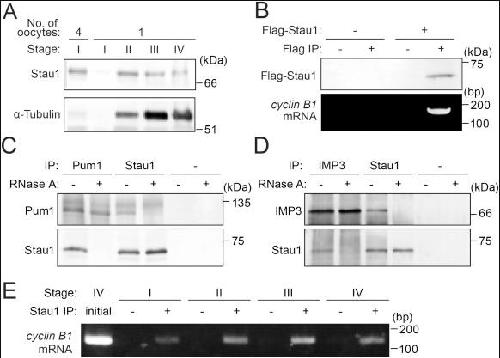 Fig. 1. Staufen1 protein (Stau1) during zebrafish oocyte growth. (A) Oocyte extracts from stages I to IV were analyzed by immunoblotting with anti-Stau1 (GP) and anti-α-Tubulin antibodies. (B) Stage IV oocytes overexpressed with (+) or without (â) Flag-Stau1 were immunoprecipitated with (+) or without (â) anti-Flag M2 antibody (Flag IP). Flag-Stau1 protein and cyclin B1 mRNA in the immunoprecipitates were detected by immunoblotting with anti-Flag M2 antibody and RT-PCR, respectively. (C) Extracts from stage IV oocytes were treated with (+) or without (â) RNase A and immunoprecipitated (IP) with anti-Pum1 (Pum1), anti-Stau1 (Stau1) or control (â) antibodies. Pum1 and Stau1 in the immunoprecipitates were detected by immunoblotting. (D) Experiments similar to those in (C) using anti-IMP3 and anti-Stau1 antibodies. (E) Extracts from stage I to IV oocytes were immunoprecipitated (Stau1 IP) with anti-Stau1 (+) or control antibodies (â) and cyclin B1 mRNA in the immunoprecipitates was detected by RT-PCR. Extracts from stage IV oocytes before immunoprecipitation were also subjected to RT-PCR to confirm the presence of cyclin B1 mRNA in the original extracts (initial).