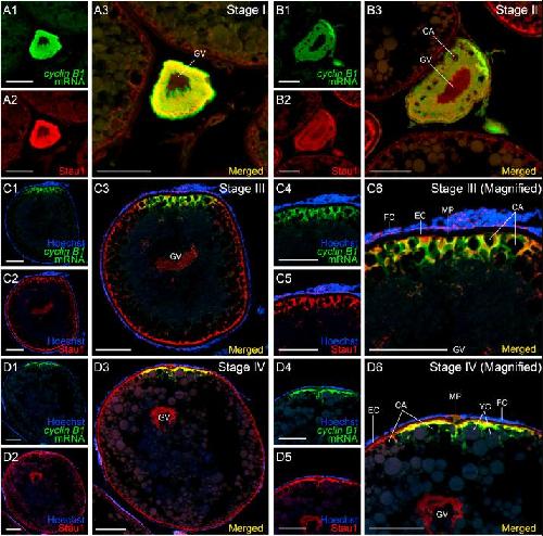 Fig. 2. Distribution of cyclin B1 mRNA and Stau1 protein during zebrafish oocyte growth. Paraffin sections of zebrafish oocytes were simultaneously analyzed by in situ hybridization and immunostaining. Hoechst 33258 staining of DNA (blue: C, D), in situ hybridization of cyclin B1 mRNA (green: A1; B1; C1, 4; D1, 4), immunostaining of Stau1 (red: A2; B2; C2, 5; D2, 5). and their merged and magnified images (A3; B3; C3, 6; D3, 6) are shown. CA, cortical alveolus; EC, egg chorion; FC, follicle cell; GV, germinal vesicle; MP, micropyle; YG, yolk granule. Scale bars, 100â¯Î¼m. (For interpretation of the references to colour in this figure legend, the reader is referred to the Web version of this article.)