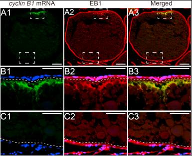 Fig. 4. Distribution of EB1 in zebrafish stage IV oocytes revealed by in situ hybridization of cyclin B1 mRNA (green), immunostaining of EB1 (red) and merged images. The animal (upper box) and vegetal (lower box) polar regions in (A) are magnified in (B) and (C), respectively. Hoechst 33258 staining of DNA is shown in blue. Broken lines indicate the boundary between the oocyte and follicle layer (B, C). Scale bars, 100â¯Î¼mâ¯(A), 50â¯Î¼mâ¯(B, C). (For interpretation of the references to colour in this figure legend, the reader is referred to the Web version of this article.)