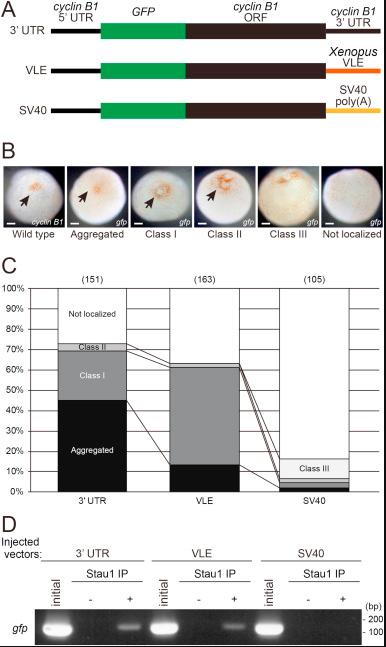 Fig. 3. Effects of 3â² UTR sequences on the gfp-cyclin B1 reporter mRNA localization to the animal polar cytoplasm. (A) Structures of reporter mRNAs. The cyclin B1 3â² UTR sequence was replaced with either Xenopus vg1/vegetal localization element (VLE) or SV40 polyadenylation signal (SV40) sequences. (B) Reporter mRNAs were detected by whole-mount in situ hybridization using a gfp probe, and the resulting signals were classified into 5 groups (Aggregated, Class I, II, III and Not localized: Class I, signal restricted to less than 1/4 of the oocyte hemisphere; class II, signal ranging from 1/4 to 1/2 of the hemisphere; and class III, signal expanding over 1/2 of the hemisphere [6]). Localization of endogenous cyclin B1 mRNAs is also shown (Wild type). Arrows indicate localized signals. Scale bars, 100 μm. (C) The numbers of oocytes showing each localized signal were counted. Data were collected from three independent experiments. The numbers in parentheses indicate the total numbers of oocytes analyzed. (D) Extracts from oocytes injected with reporter constructs (3â² UTR, VLE, SV40) were subjected to immunoprecipitation with (+) or without (â) anti-Stau1 antibody. The reporter mRNAs in the immunoprecipitates (Stau1 IP) and extracts before immunoprecipitation (initial) were detected by RT-PCR using the gfp sequence.