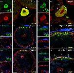 Fig. 2. Distribution of cyclin B1 mRNA and Stau1 protein during zebrafish oocyte growth. Paraffin sections of zebrafish oocytes were simultaneously analyzed by in situ hybridization and immunostaining. Hoechst 33258 staining of DNA (blue: C, D), in situ hybridization of cyclin B1 mRNA (green: A1; B1; C1, 4; D1, 4), immunostaining of Stau1 (red: A2; B2; C2, 5; D2, 5). and their merged and magnified images (A3; B3; C3, 6; D3, 6) are shown. CA, cortical alveolus; EC, egg chorion; FC, follicle cell; GV, germinal vesicle; MP, micropyle; YG, yolk granule. Scale bars, 100â¯Î¼m. (For interpretation of the references to colour in this figure legend, the reader is referred to the Web version of this article.)