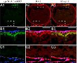 Fig. 4. Distribution of EB1 in zebrafish stage IV oocytes revealed by in situ hybridization of cyclin B1 mRNA (green), immunostaining of EB1 (red) and merged images. The animal (upper box) and vegetal (lower box) polar regions in (A) are magnified in (B) and (C), respectively. Hoechst 33258 staining of DNA is shown in blue. Broken lines indicate the boundary between the oocyte and follicle layer (B, C). Scale bars, 100â¯Î¼mâ¯(A), 50â¯Î¼mâ¯(B, C). (For interpretation of the references to colour in this figure legend, the reader is referred to the Web version of this article.)