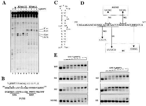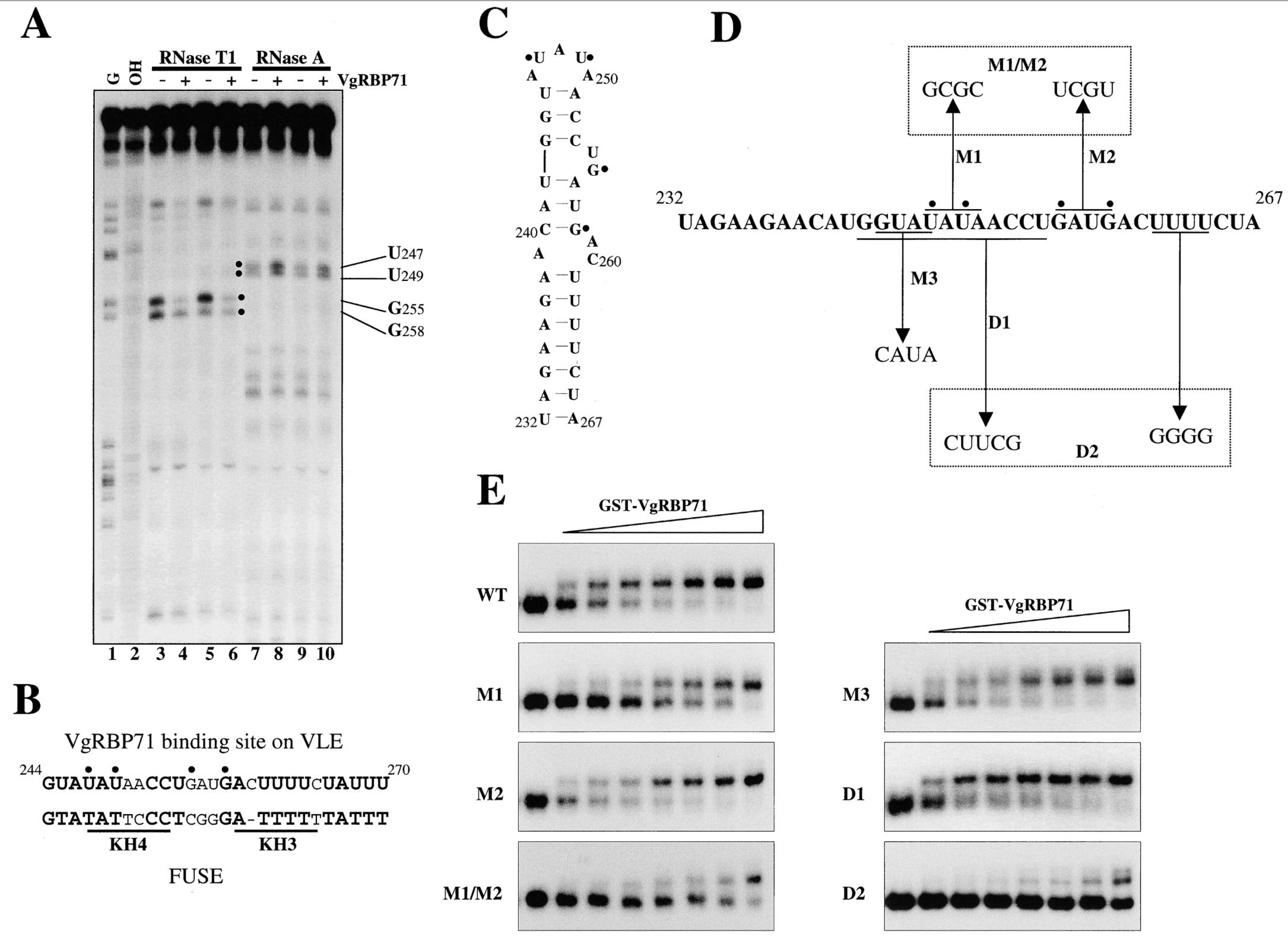 (B) Comparison of the sequence at the binding site for VgRBP71 in the VLE (top) and the sequence of FUSE (bottom). Closed circles indicate the protected guanosines and hypersensitive uridines in the VLE. Positions of sequence identity are in bold lettering. The sites in FUSE contacted by the KH3 and KH4 domains of human FBP (Braddock et al., 2002) are indicated.