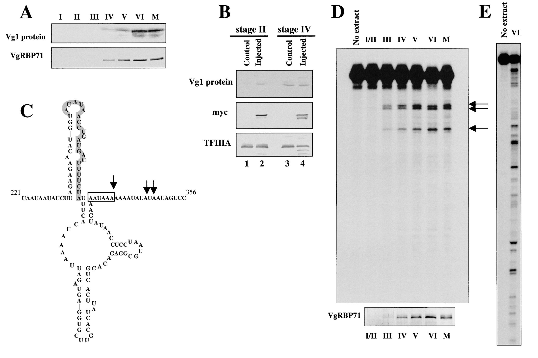 (C) Predicted secondary structure of the 3â² end of the VLE. The binding site for VgRBP71 is indicated by shading. A box encloses the AAUAAA polyadenylation element, and arrows mark the sites of cleavage detected in the in vitro assay. This structure was generated using mfold version 3.1.