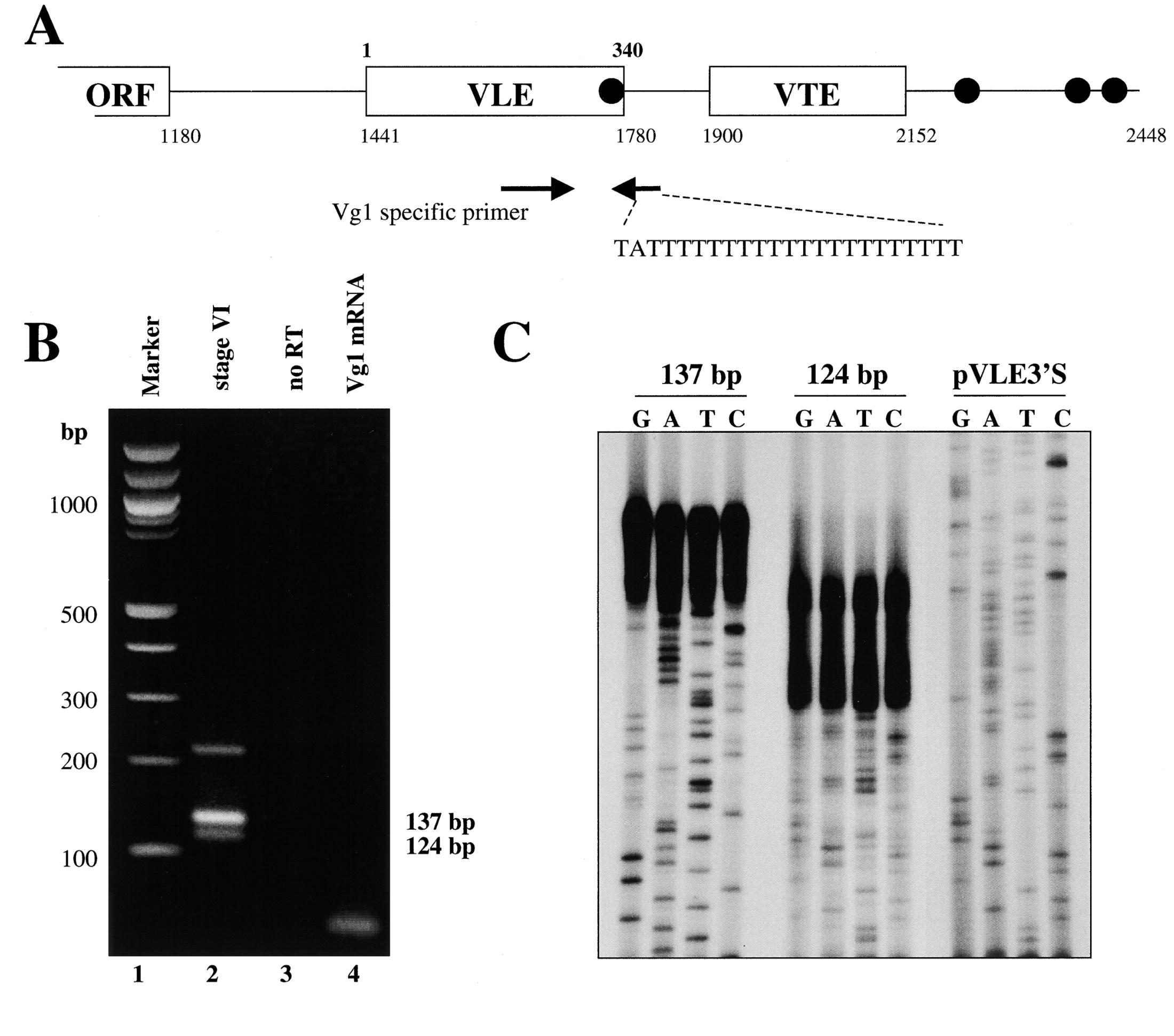 (C) The DNA sequence of the 137 bp and 124 bp PCR fragments are compared with the sequence of pVLE3â²S, which carries nt 1669â1816 of the Vg1 mRNA 3â²UTR. The poly(A) track in the two PCR products causes smearing in all four sequencing reactions.