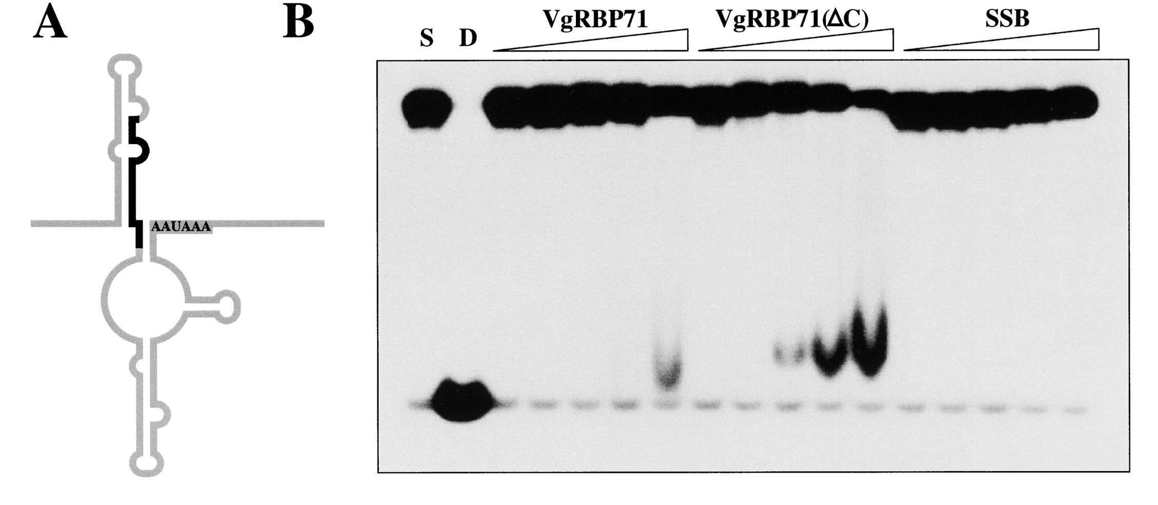 (B) The 16 nt oligoribonucleotide was radiolabeled with 32P and annealed to VLE(168-376) RNA. This duplex was incubated with 10, 50, 100, 200, or 500 nM VgRBP71, VgRBP71(δC), or single-stranded DNA binding protein (SSB). The products were analyzed by electrophoresis on a 15% nondenaturing polyacrylamide gel. Lane S is the duplex substrate, and lane D is substrate after heat denaturation.