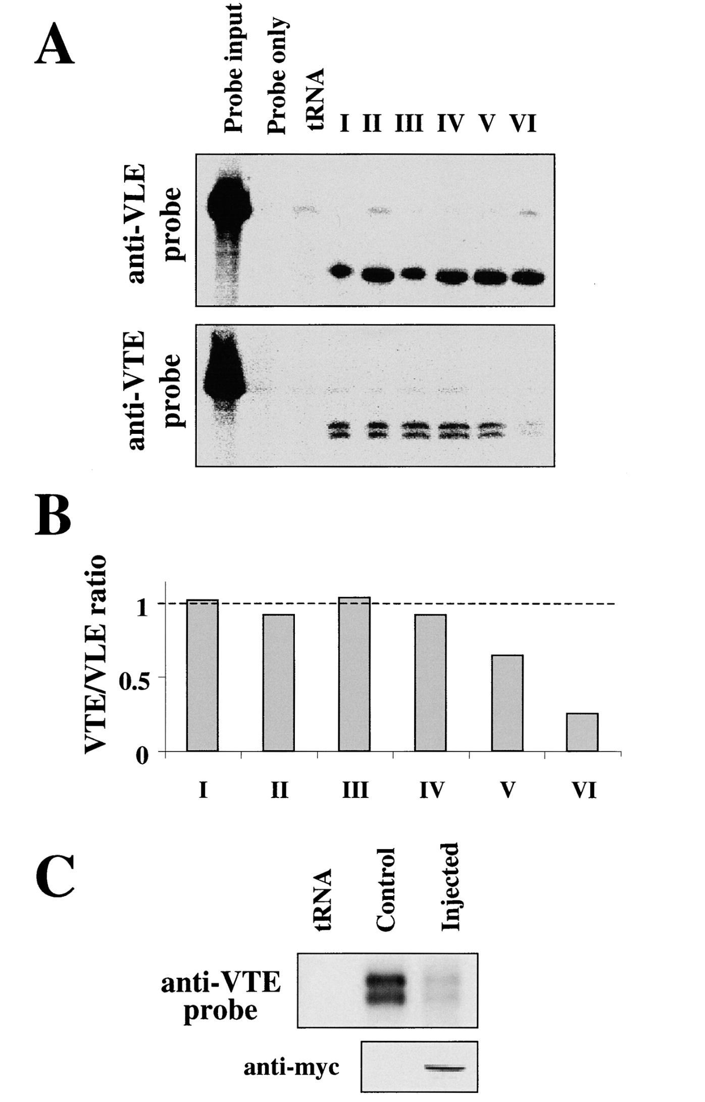 (A) Total RNA was isolated from staged oocytes and used in RNase protection assays with internally radiolabeled probes that spanned either the VLE (top panel) or the VTE (bottom panel). Control reactions contained probe alone or 20 μg of tRNA. After digestion with ribonuclease, the samples were analyzed by electrophoresis.