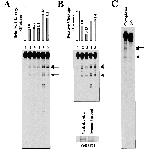 (A) VgRBP71 footprint. VLE(229-376) either in the presence (+) or absence (â) of VgRBP71 was digested with 1.4 à 10â4 (lanes 3 and 4) or 8.4 à 10â5 (lanes 5 and 6) units of RNase T1, or 0.1 (lanes 7 and 8) or 0.06 μg/ml (lanes 9 and 10) RNase A. Lane 1 is a T1 digestion under denaturing conditions, and lane 2 is an alkaline hydrolysate. Closed circles indicate the protected guanosines and hypersensitive uridines.