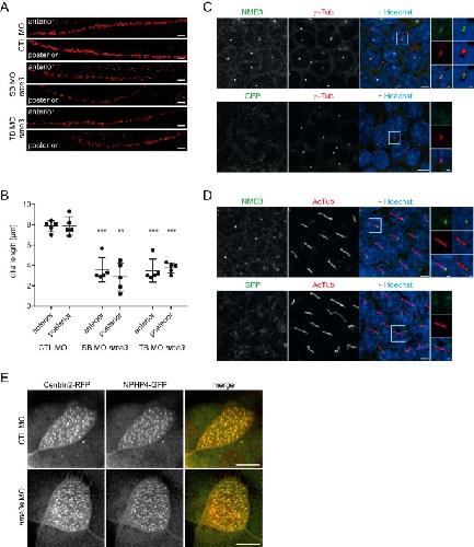 A, confocal images of the anterior and posterior segments of the ciliated pronephric tubules of 24-hpf control (CTL) and nme3-deficient zebrafish embryos. Cilia were visualized by acetylated tubulin staining. Scale bars, 10 μm. B, quantification of the ciliary length in pronephric tubules. In contrast to the controls, ciliary length was affected by knockdown of nme3 (**, p = 0.0063; ***, p < 0.001; t test, error bars represent S.D.). C, confocal images of 6-day-starved mIMCD3 cells stained with antibodies against γ-tubulin (γ-Tub) (centrosomal marker; red), NME3 (green), and Hoechst (DNA; blue). NME3 colocalizes with γ-tubulin at the centrioles of centrosomes. D, costaining of cilia by acetylated tubulin (AcTub) (ciliary axoneme; red) identifies NME3 at the basal body of primary cilia. Immunofluorescence staining with an anti-GFP antibody serves as a control and results in the absence of centrosome and basal body labeling (bottom row). Scale bars, 5 μm. Magnifications and three-dimensional reconstructions are shown in white boxes. E, NPHP4âGFP and CentrinâRFP were coexpressed in epidermal multiciliated cells of stage 30 Xenopus embryos and detected by confocal microscopy. NPHP4 colocalization with the basal body marker Centrin was not altered by injection of nme3a morpholino in at least 25 cells observed in three experiments. Scale bars, 1 (C and D) and 10 μm (E).